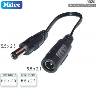 Conector Adaptador - Marca: MILEC - Modelo: 5525 - Conector 1 - 5.5 x 2.5 Macho - Conector 2 : 5.5 x 2.1 Hembra